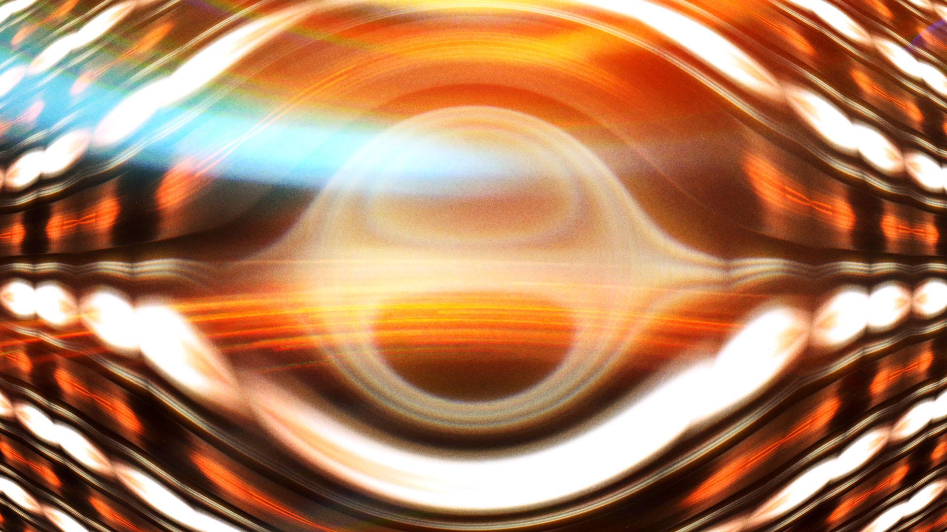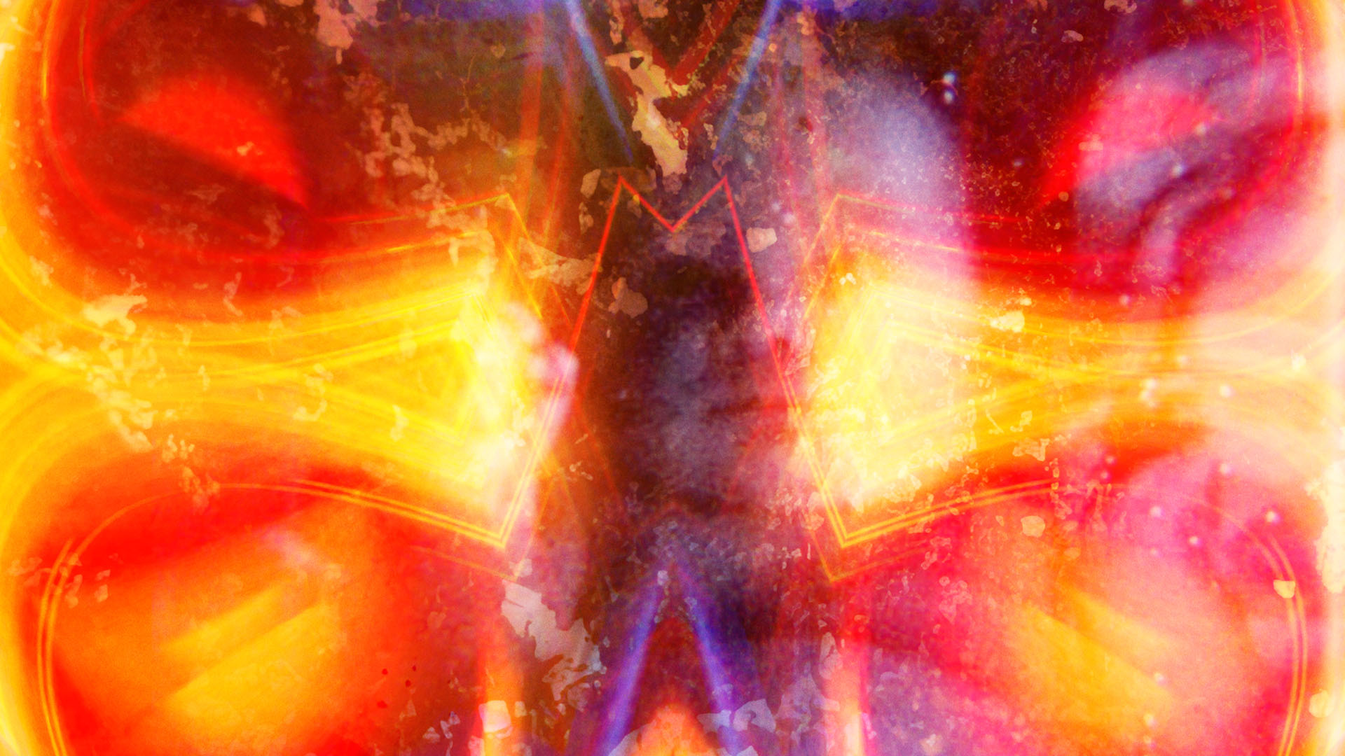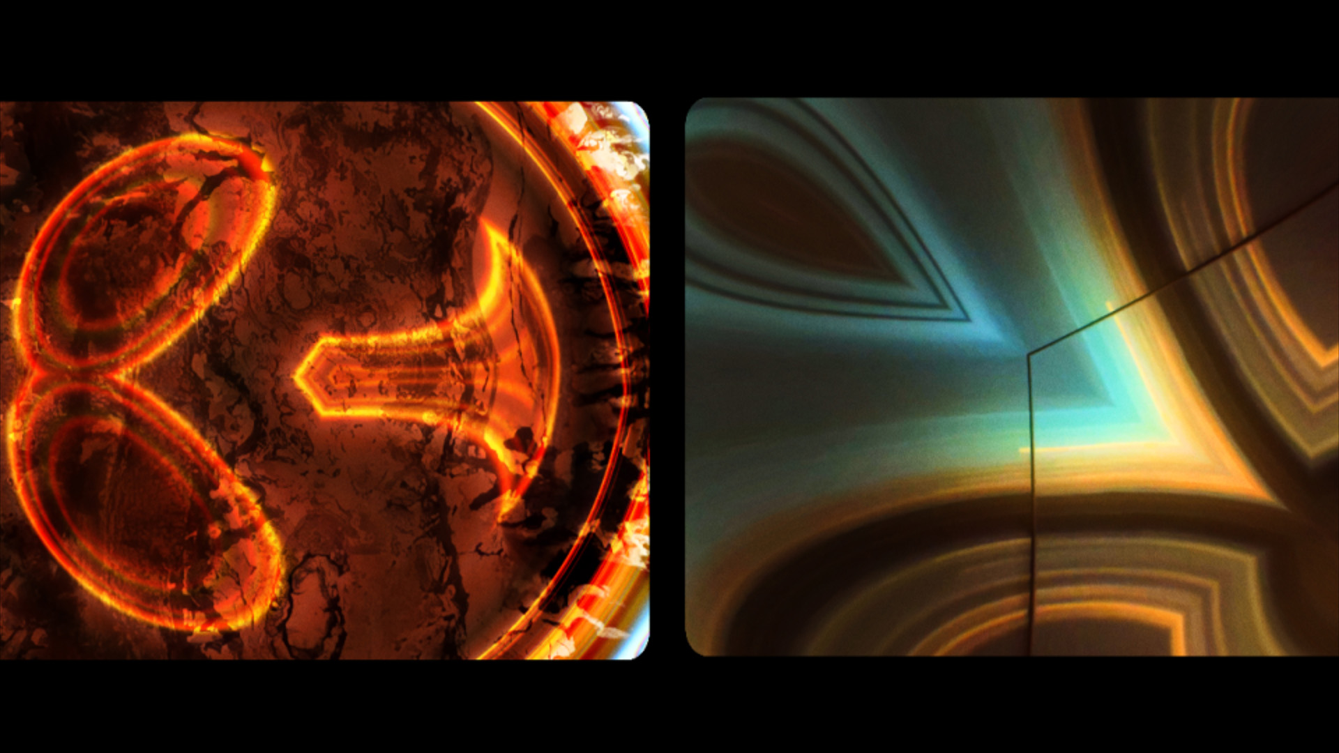 The abstract visual layers, filled with brilliant bands of color, mostly warmly glowing reds, yellows and oranges and set off by areas of blue and green, often suggest the sensation of gliding smoothly upwards, and add to the feeling that we are ascending towards some realization. The imagery is symmetrically reflected in kaleidoscopic patterns, although irregular ones, and the compositions play with how to set symmetrical patterns within the rectangular format of widescreen video. The sleek, stylish angles of the bands of color are reminiscent of something one might see in an Art Deco period elevator, for example in New York’s Rockefeller Center.