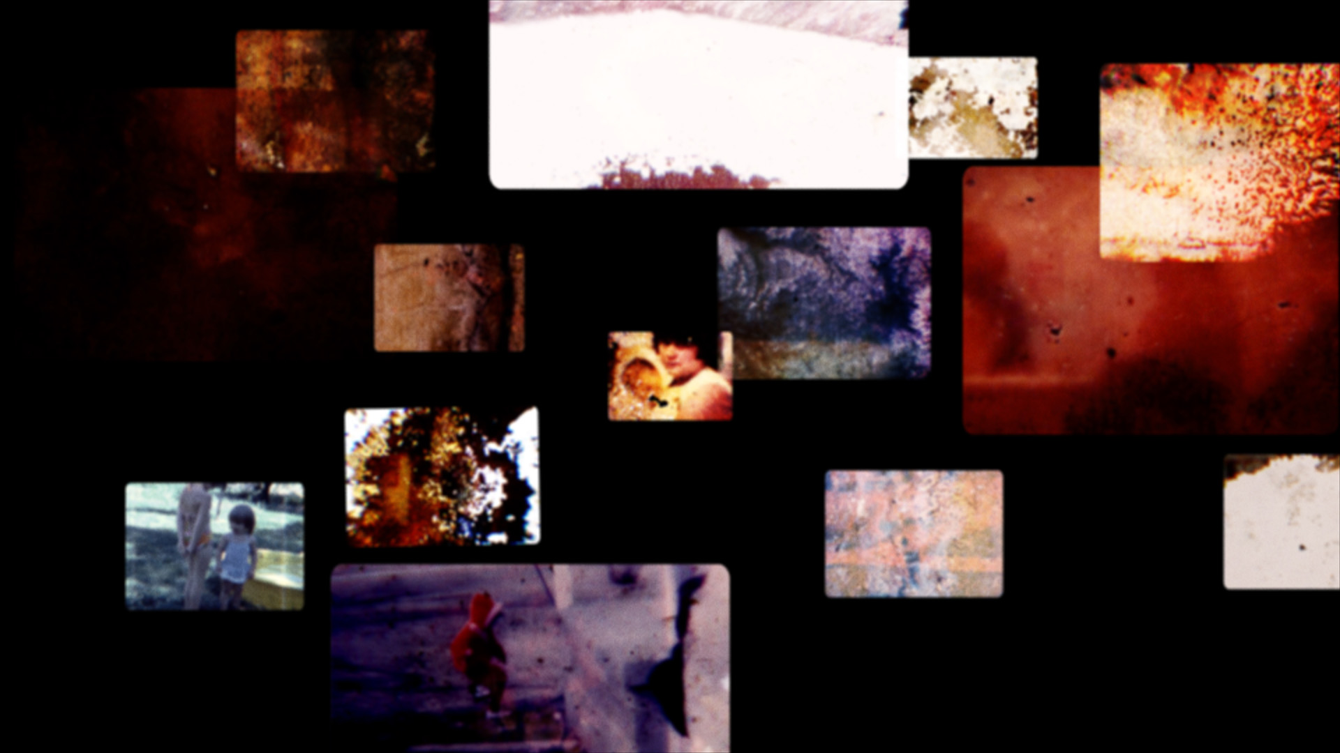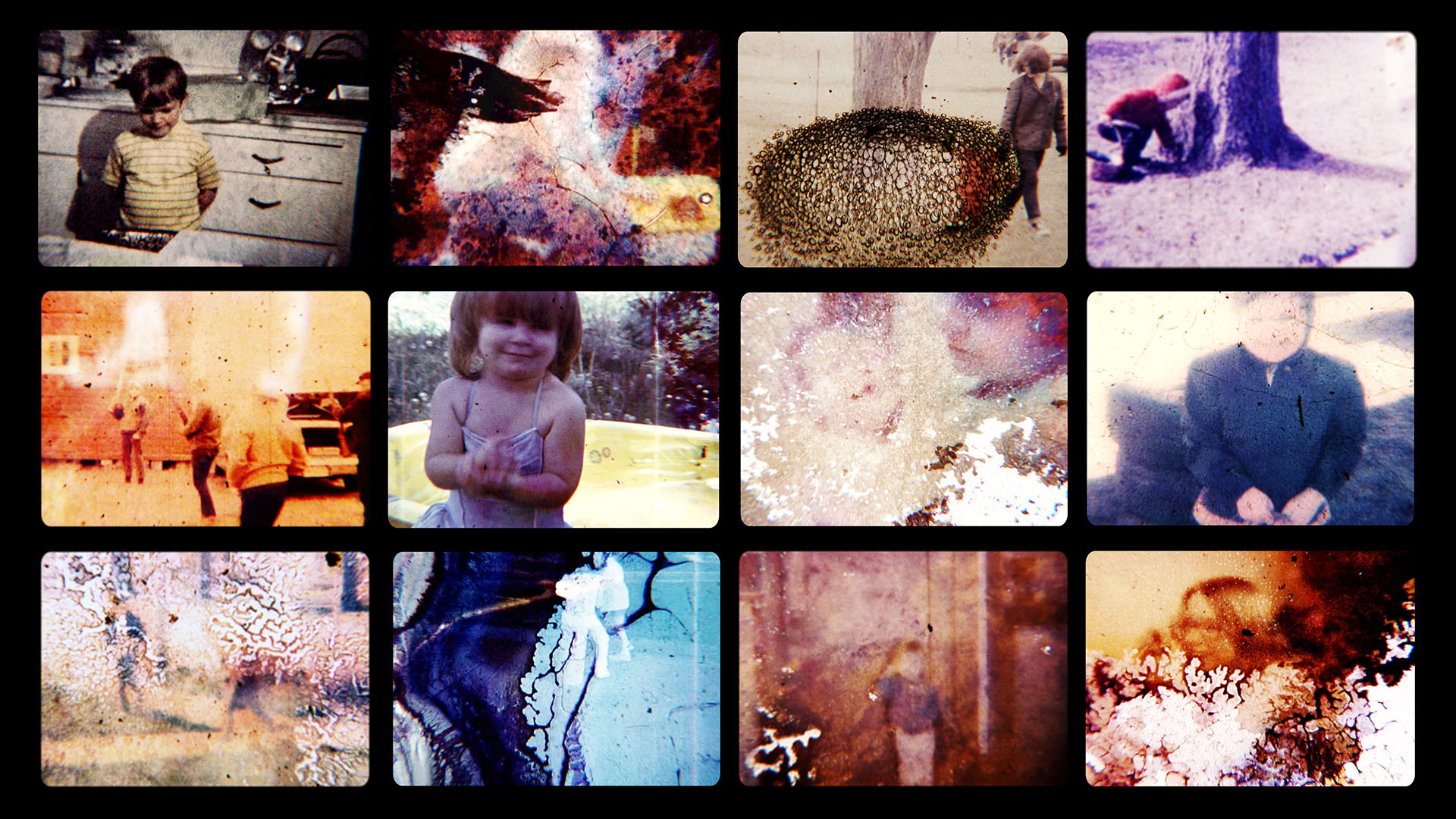 The Fifth Floor, a new 8 minute film by David Baeumler, juxtaposes two very different visual textures. The film begins with a four by three grid of home movies, typical footage of kids playing, exploring, getting into innocent trouble. The filmstrips of these old movies have been heavily hand-processed, covered with constantly shifting splotches and colors, as if they had been left in a trashcan for weeks and had grown moldy. These old movies are soon shown surrounded by completely abstract digital layers, compositions of colors and shapes.